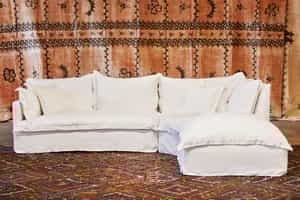 The Brook Sofa, by John Derian, features a low back, rolled arms, and all-over hand tufting. Inspired by a French sofa, it offers generous seating and room to stretch out. Choose from four linen or six velvet choices—or have it covered in your fabric choice.