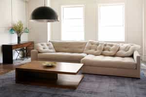 The John Derian Penny Sofa boasts a distinct circular design similar to the Coin Sofa, but in a smaller version. It provides an elegant centerpiece to a living area, or can be split into two pieces for extra seating along a wall.