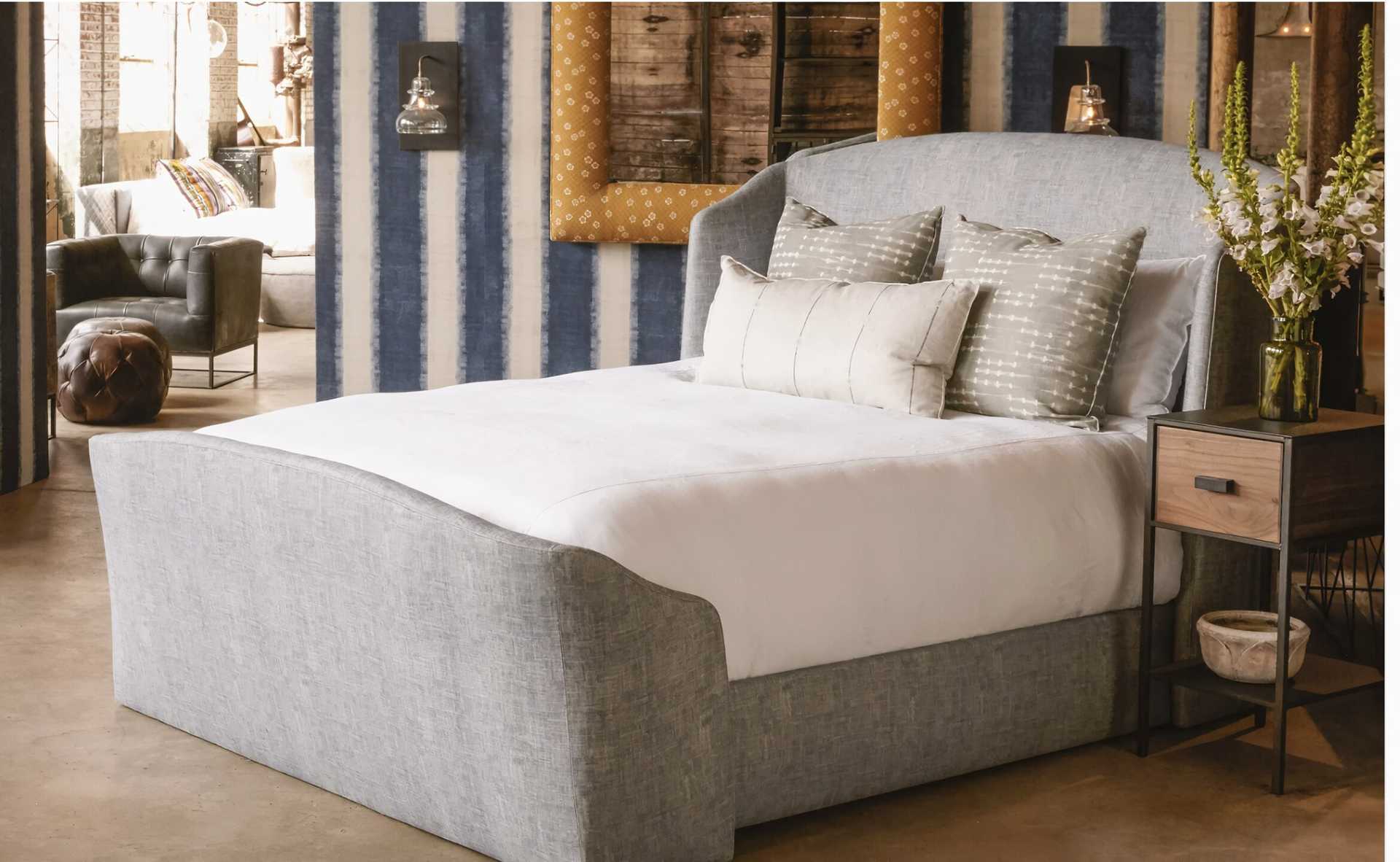 Cisco Brothers Arabella Bed is a customizable bed that can be covered in your choice of fabric (see here). This model features a luxurious padded headboard for your comfort. It is available in Queen, King, and Cal King sizes.