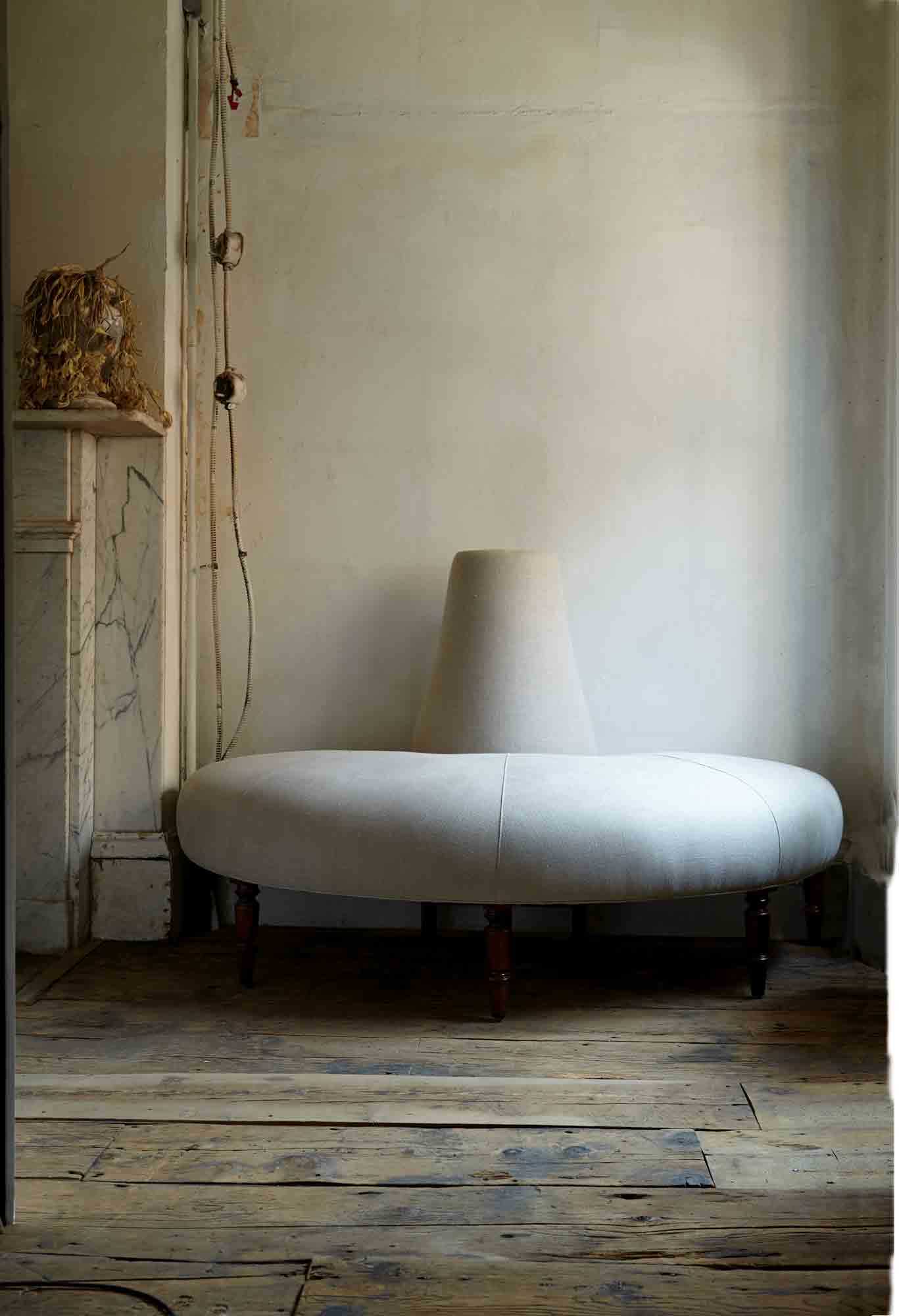 The Cisco Home Coin Half Sofa by John Derian features a distinct half-circle design, perfect for short walls. Measuring 60 inches wide and 39 inches high, it includes elegant 9-inch decorative legs with a maple and fruitwood finish. Made in the USA with FSC® Certified Hard Wood and eco-friendly options, this customizable sofa combines style, comfort, and sustainability.