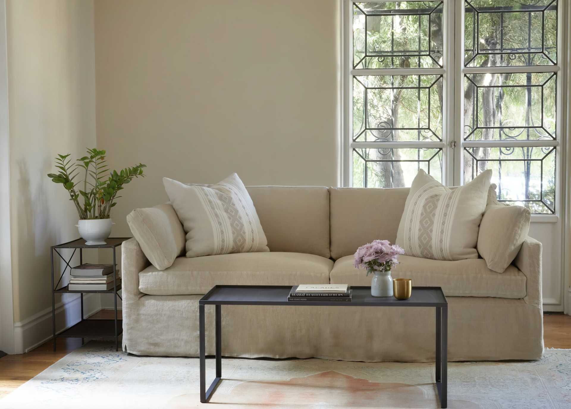 The Cisco Home Louis Sofa blends modern and coastal aesthetics with clean lines, a straight skirt, and a subtle 2-inch slit. Measuring 78 or 90 inches wide and 31 inches high, it features two-over-two cushions and maple wood legs with an umber stain for added elegance. Customizable and eco-friendly, this sofa combines style, comfort, and sustainability, making it a perfect addition to any living space.